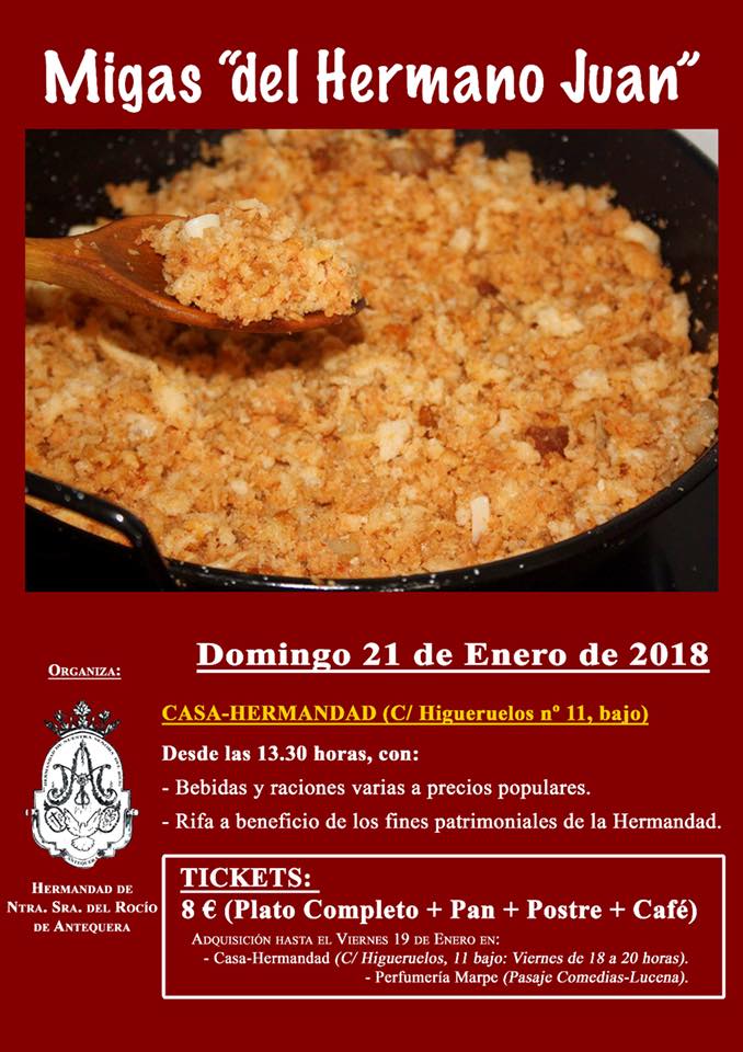 Los tickets a 8€ (Migas Completas + Postre + Café), se podrán adquirir en Perfumería Marpe (Pasaje Lucena – Comedias) y en Casa Hermandad en horario de oficina (Viernes de 18 a 20 horas) hasta el viernes 19 de Enero.