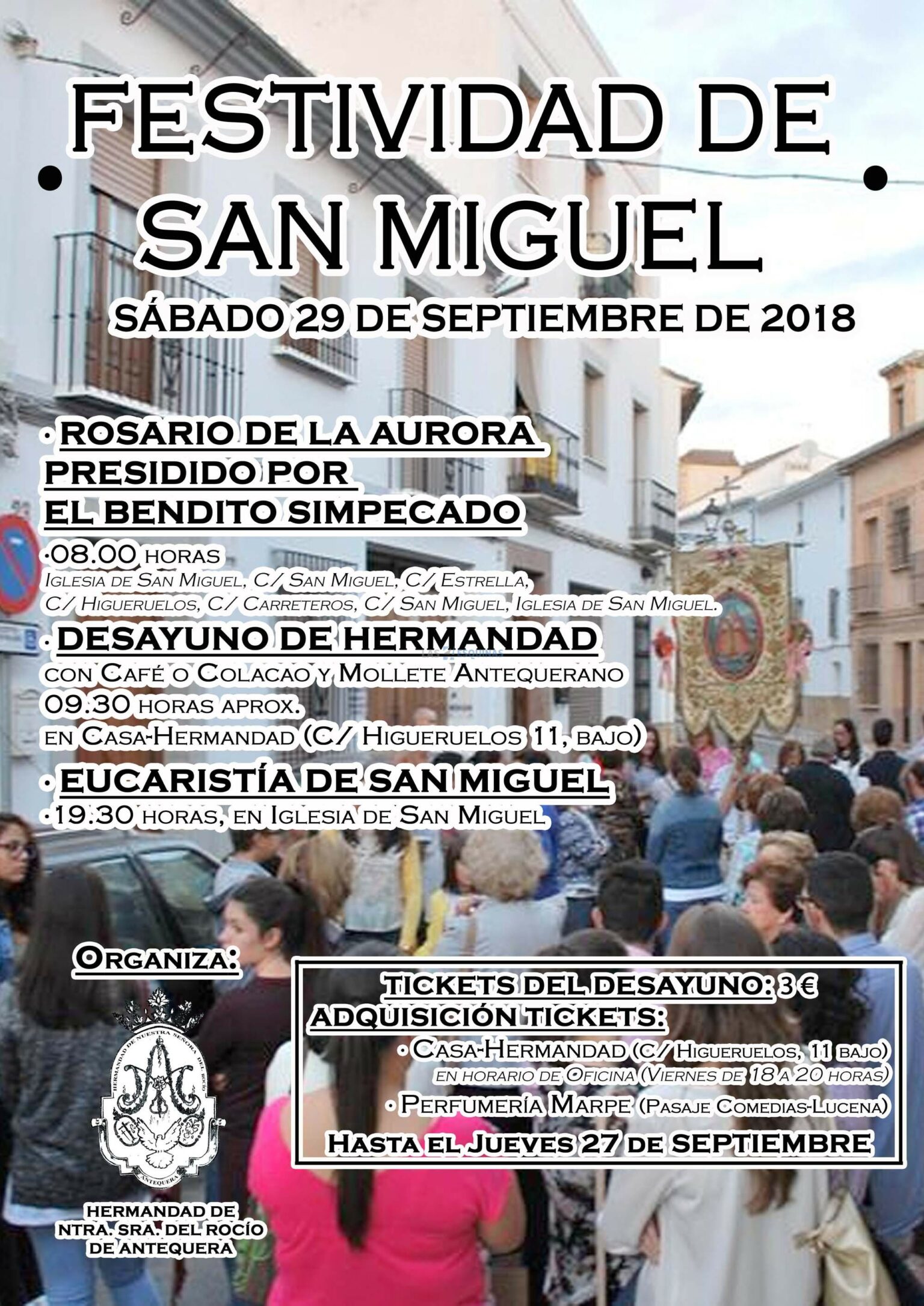 La Hermandad de Nuestra Señora del Rocío de Antequera celebrará el próximo sábado 29 se septiembre la festividad de San Miguel. Dicha celebración comenzará con el tradicional Rosario de la Aurora por las calles del barrio. La celebración estará presidida por el Simpecado de la Hermandad.