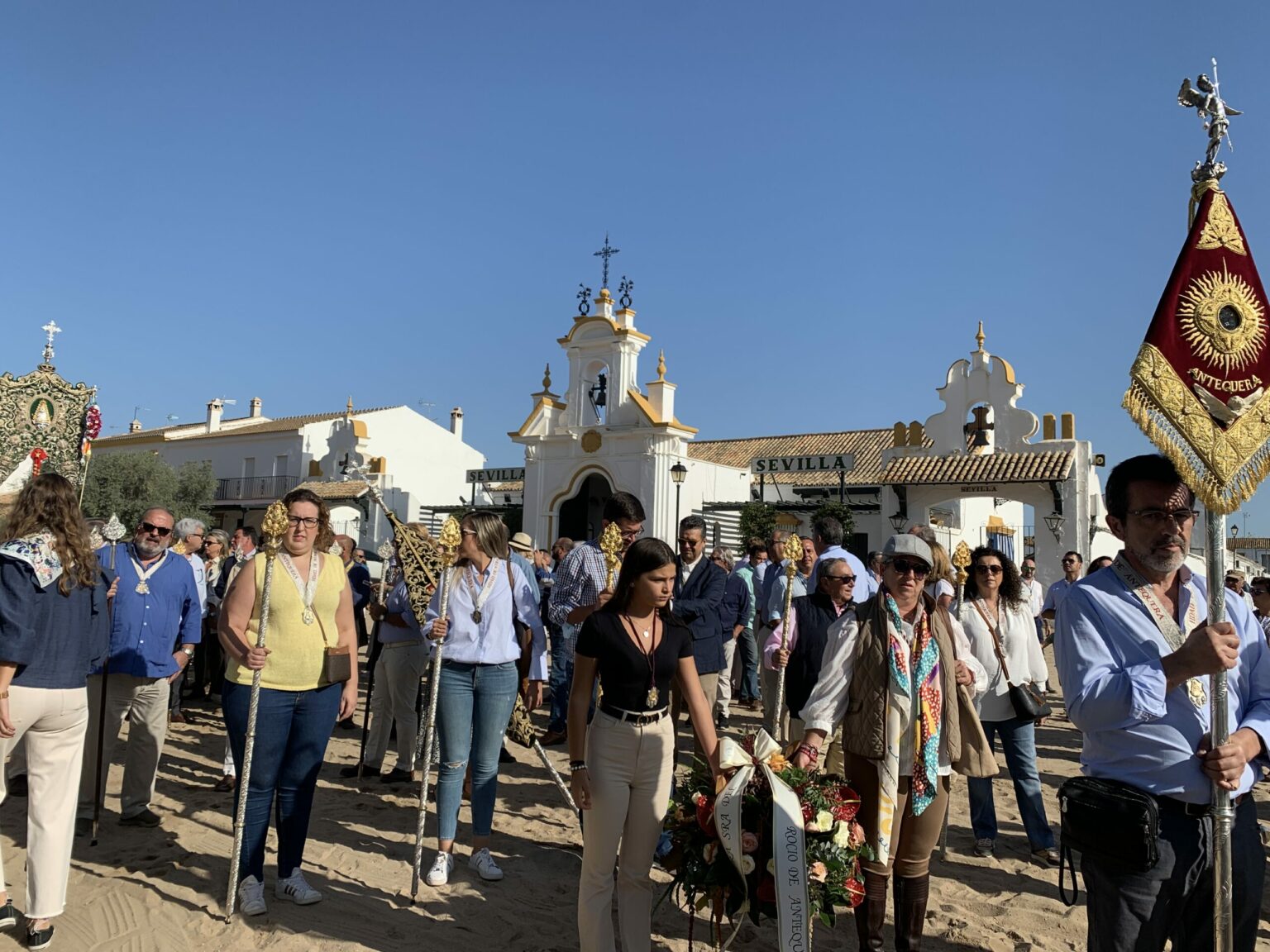 A diferencia de otras hermandades no filiales, Antequera tendrá que esperar para ver su Simpecado ante la Señora, dado que el día de la peregrinación no siempre coincide en domingo o lunes que permita participar en el rosario de Hermandades previo que se hace los sábados en la aldea.