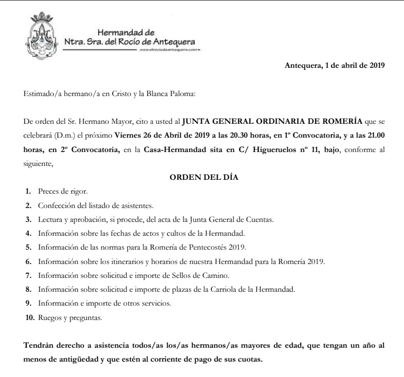 El orden del día de la convocatoria será el siguiente: Preces de rigor, confección del listado de asistentes, lectura y aprobación, si procede, del acta de la Junta General de Cuentas, Información sobre las fechas de actos y cultos de la Hermandad, Información de las normas para la Romería de Pentecostés 2019, Información sobre los itinerarios y horarios de la Hermandad para la Romería 2019, Información sobre solicitud e importe de Sellos de Camino, Información sobre solicitud e importe de plazas de la Carriola de la Hermandad, Información e importe de otros servicios, así como ruegos y preguntas.