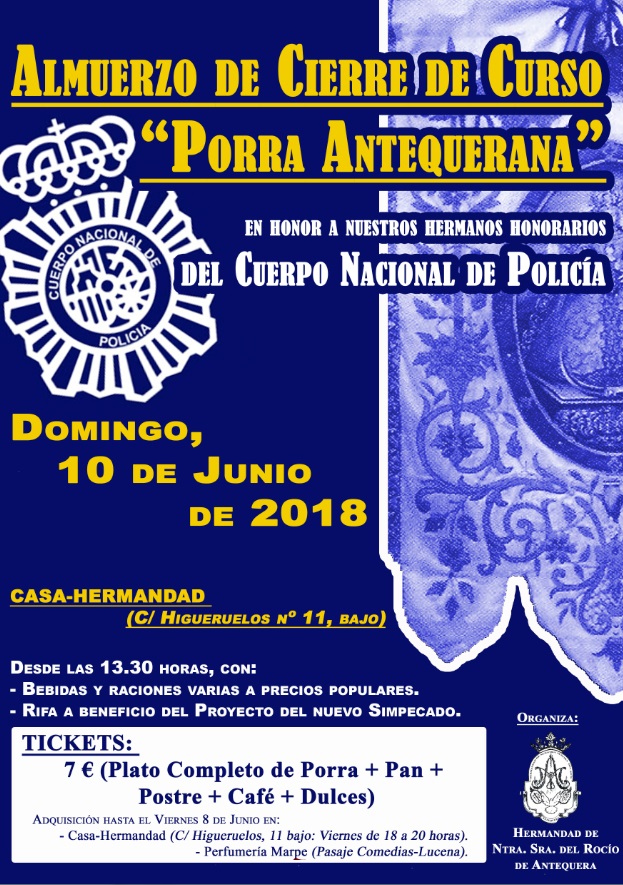 El almuerzo incluye plato completo de Porra, Pan, Postre, Café y dulces. El precio del ticket es de siete euros que se puede adquirir hasta este viernes 8 de junio en Perfumeria Marpe (Pasaje Comedias-Lucena) y en la Casa Hermandad este viernes de 18.00 a 20.00 horas.
