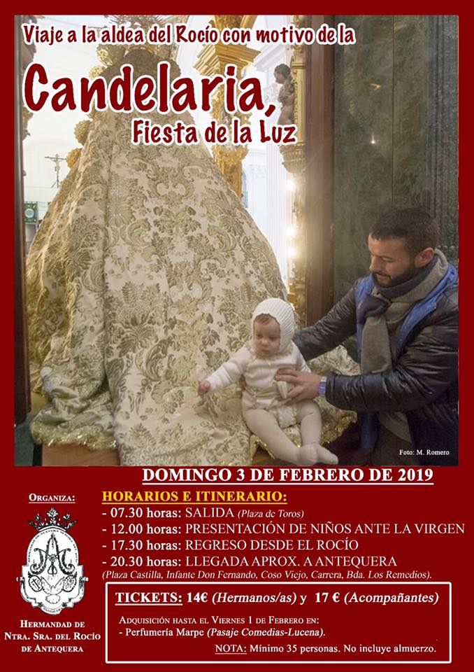 La Hermandad del Rocío de Antequera organiza Viaje a la aldea del Rocío con motivo de la Candelaria – Fiesta de la Luz  que tendrá lugar el próximo domingo 3 de febrero.