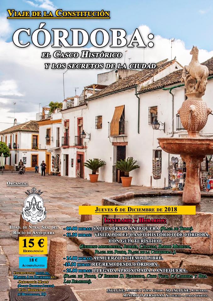 Como viene siendo tradicional, coincidiendo con el 6 de diciembre, dia de la Constitución, la Hermandad del Rocío de Antequera organiza viaje. En esta ocasión visitarán la ciudad de Córdoba. En dicha visita, realizarán un tour guiado por los lugares más emblemáticos del casco histórico de Córdoba, disponiendo también de tiempo libre para el almuerzo y ocio.