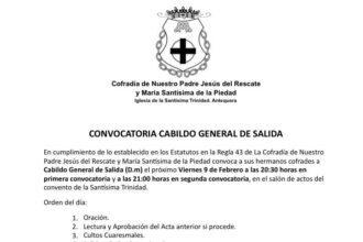 Tras la salida, tendrá lugar un ágape fraterno en Casa Hermandad para el que se ruega a los hermanos aporten un plato para compartir (pueden depositarlo en Casa Hermandad de 18.00 a 18.20 horas).