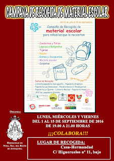 Quienes deseen colaborar con esta iniciativa pueden entregar lápices, sacapuntas, bolígrafos, gomas, rotuladores, libretas, mochilas, estuches, etc. en la Casa Hermandad -sita en calle Higuruelos, 11- entre el 1 y 15 de septiembre, los lunes, miércoles y viernes en horario de 19 a 21 horas.
