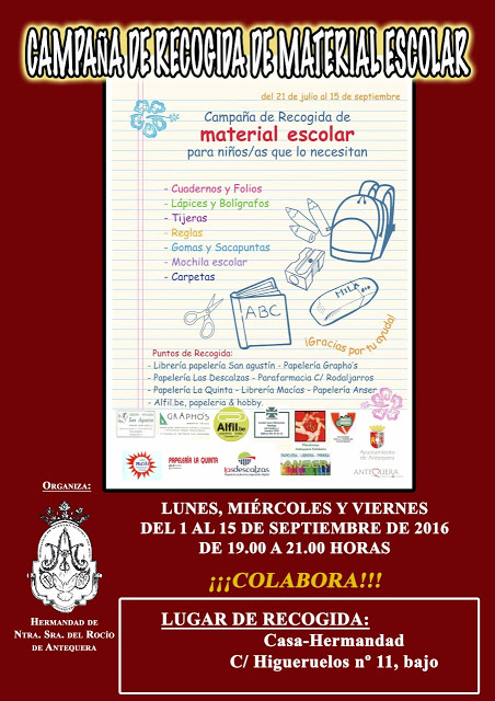 La Hermandad del Rocío de Antequera colabora otro año más con la recogida de material escolar para la Plataforma Antequera Solidaria.