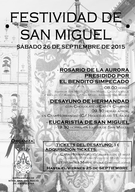 La Hermandad del Rocio de Antequera, con motivo de la próxima Festividad de San Miguel, Patrón de su Parroquia y de su barrio organiza Rosario de la Aurora con su Bendito Simpecado tal y como recogen en sus Estatutos.