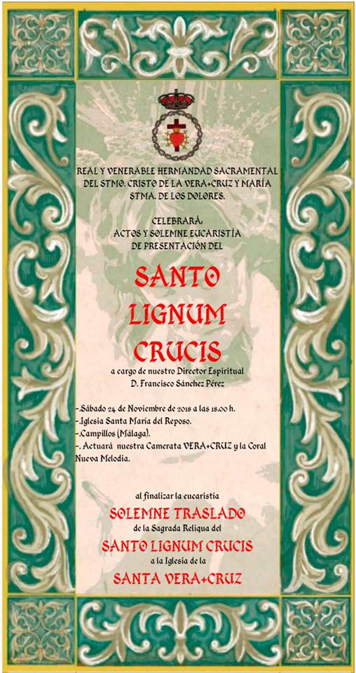 La Real y Venerable Hermandad Sacramental del Cristo de la Veracruz y María Santísima de los Dolores celebra este sábado solemne Eucaristia y Acto de presentación del Lignum Crucis, a cargo de su Director Espiritual don Francisco Sánchez.