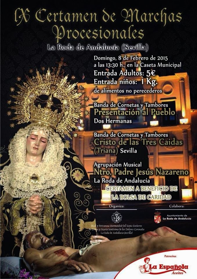 La Hermandad del Santo Entierro y María Santisima de los Dolores Coronada de La Roda de Andalucía organizan el Noveno Certamen de Marchas Procesionales que tendrá un caracter solidario, ya que la entrada será de 5 euros para adultos y 1 kilo de alimentos no perecederos los niños, que irá destinado a la Bolsa de Caridad.