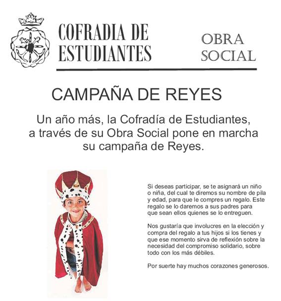 La Hermandad del Santo Cristo Coronado de Espinas y Nuestra Señora de Gracia y Esperanza de Málaga informa que como en años anteriores, el Área de Obra Social de la Hermandad vuelve a organizar la ya tradicional “Campaña de Reyes”para acercar la ilusión a aquellos que más lo necesitan durante esta época tan señalada.
