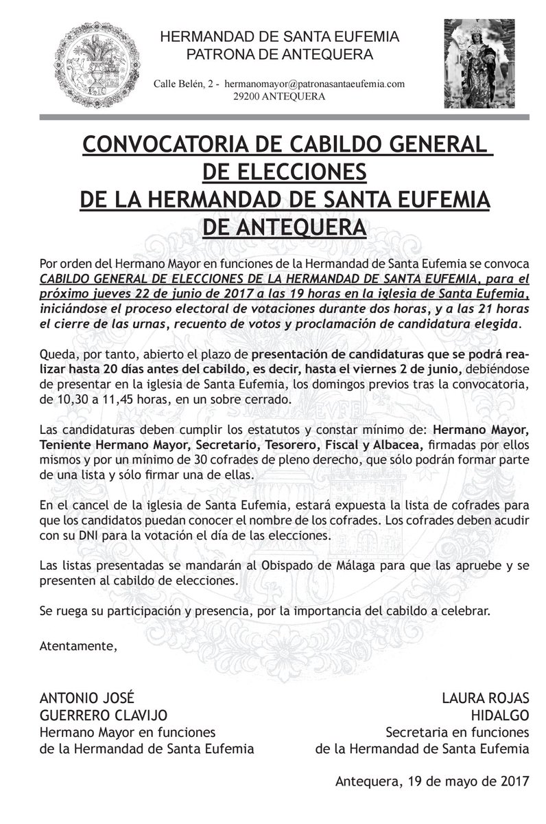 Por orden del Hermano Mayor en funciones de la Hermandad de Santa Eufemia de Antequera, se convoca Cabildo General de Elecciones para el próximo jueves 22 de junio.