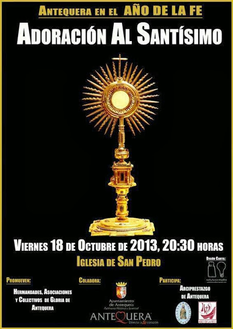 ANTEQUERA, IGLESIA DE SAN PEDRO. VIERNES 18 DE OCTUBRE, DE 20:30 A 22:30 HORAS. Organizado por Hermandades y Asociaciones de Gloria de Antequera en la Iglesia de San Pedro para la Adoración al Santísimo Sacramento.