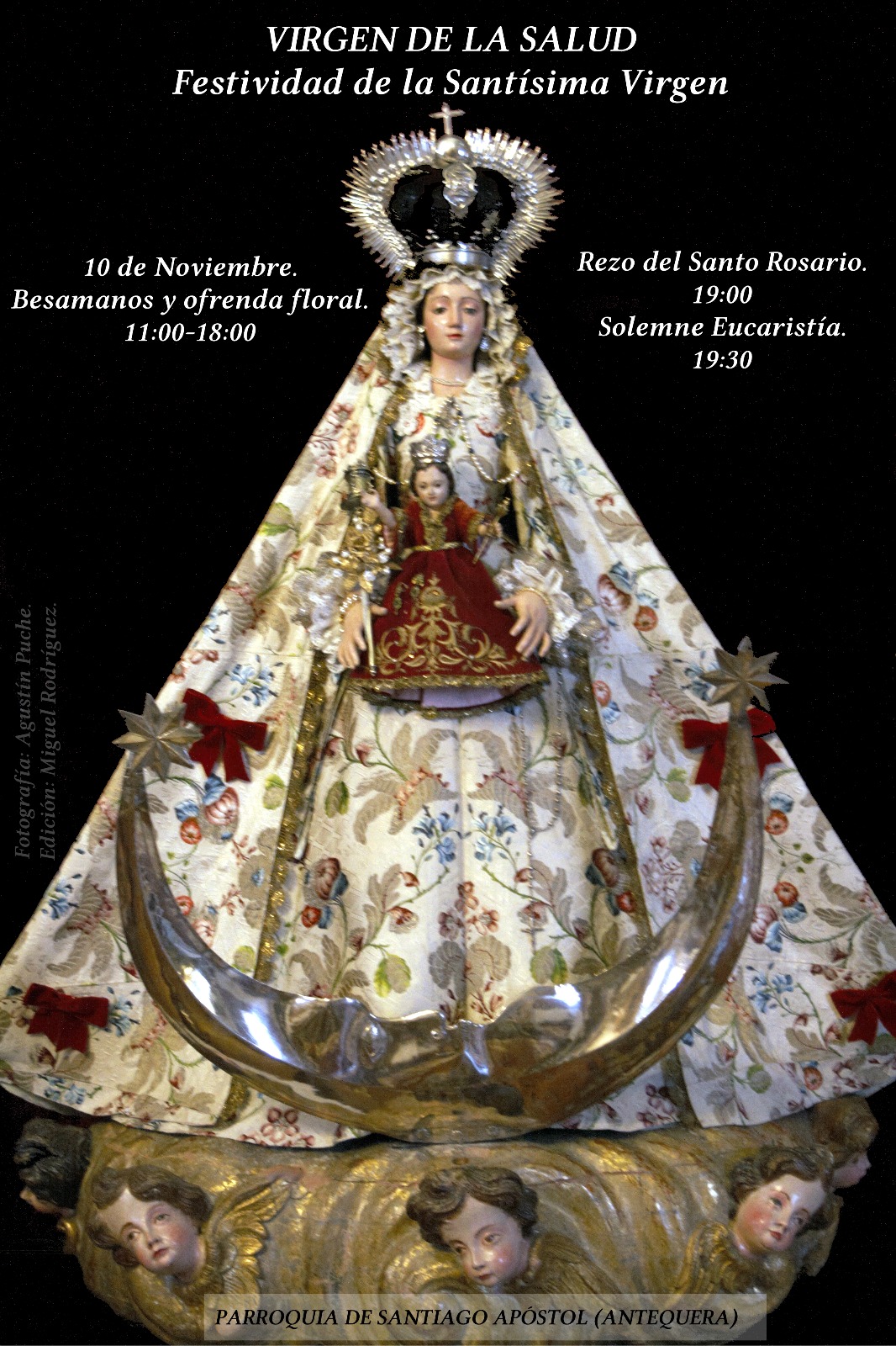 El próximo sábado 10 de Noviembre la Parroquia de Santiago de Antequera celebra la festividad de la Virgen de la Salud. Para ello, la Sagrada imagen se encuentra expuesta en devoto besamanos, organizándose también ofrenda floral.