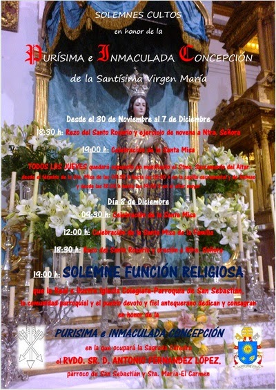 19:00 h: Solemne Función Religiosa que la Real e Ilustre Iglesia Colegiata-Parroquia de San Sebastián, la comunidad parroquial y el pueblo devoto y fiel antequerano dedican y consagran en honor de la PURISIMA e INMACULADA CONCEPCIÓN en la que ocupará la Sagrada Cátedra el RVDO. SR. D. Antonio Fernández López, párroco de San Sebastián y Sta. María-El Carmen, y Arcipreste de Antequera.