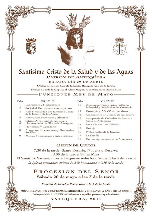 Un año más, Antequera dedica sus tradicionales novenas al Cristo de la Salud y Aguas, Patrón de la ciudad. Para este año la Real Hermandad ha aprobado la incorporación de dos nuevo colectivos en los gremios: Hermandades de Gloria de Antequera (día 6) y Cáritas Arciprestal de Antequera (día 5).