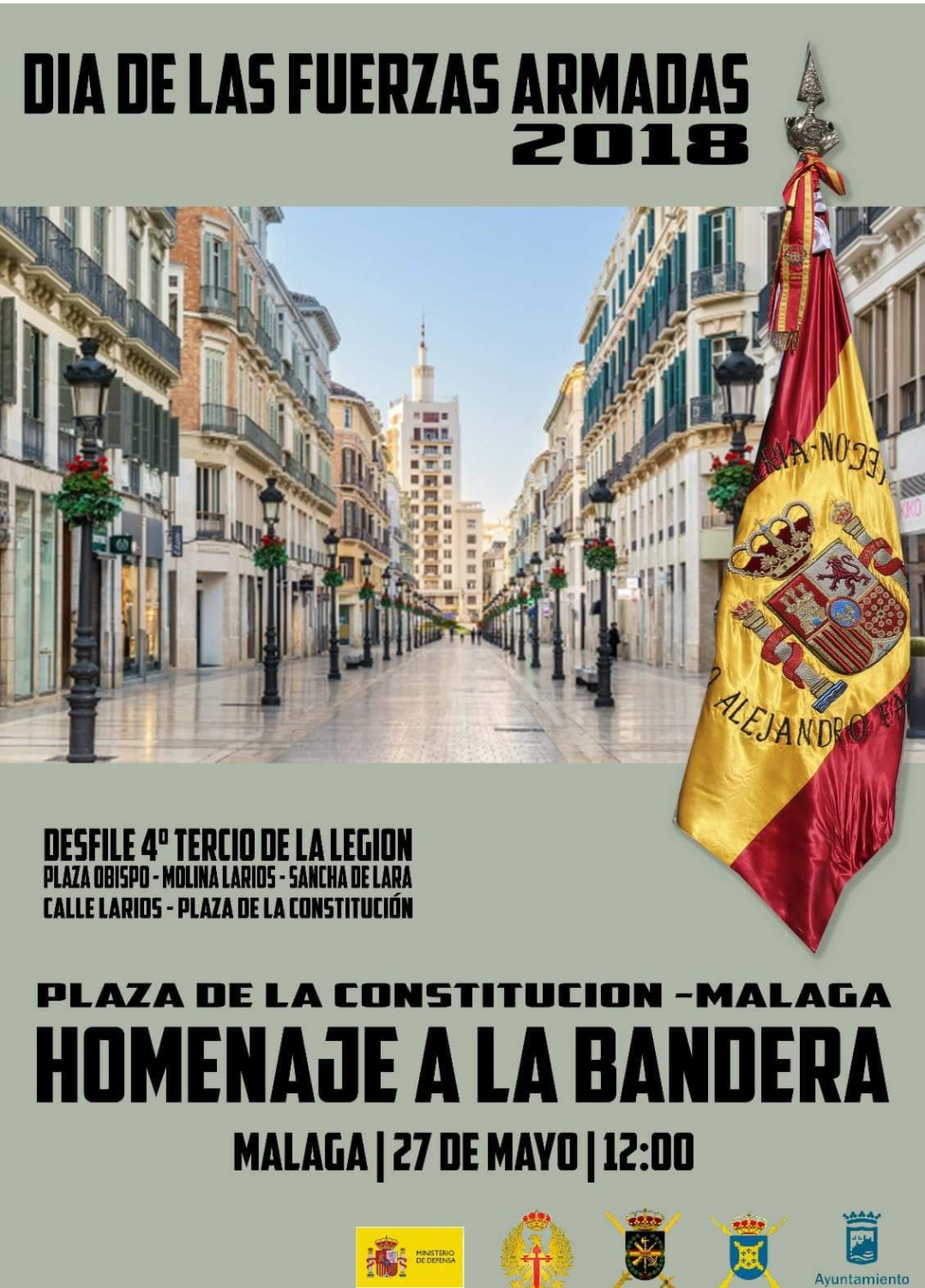 El próximo domingo día 27 de mayo el Cuarto Tercio de la Legión Alejandro Farnesio desfilarán en Málaga por Plaza del Obispo, Molina Larios, Sancha de Lara, Larios y Plaza de la Constitucion, con motivo del día de las Fuerzas Armadas y para rendir homenaje a la bandera de España en la Plaza de la Constitución. El acto tendrá lugar a las 12.00 horas.