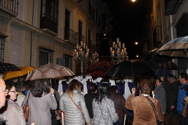 Sin embargo, apenas habiendo recorrido las primeras calles previstas en el itinerario, la lluvia hizo acto de presencia en torno a las nueve de la noche. La meteorología no permitió que la cofradía hiciera su entrada en la carrera oficial, por lo que el cortejo procesional tuvo que recortar su camino para dirigirse con paso acelerado y entre los vítores de los devotos hacia su barrio, el de la Trinidad.