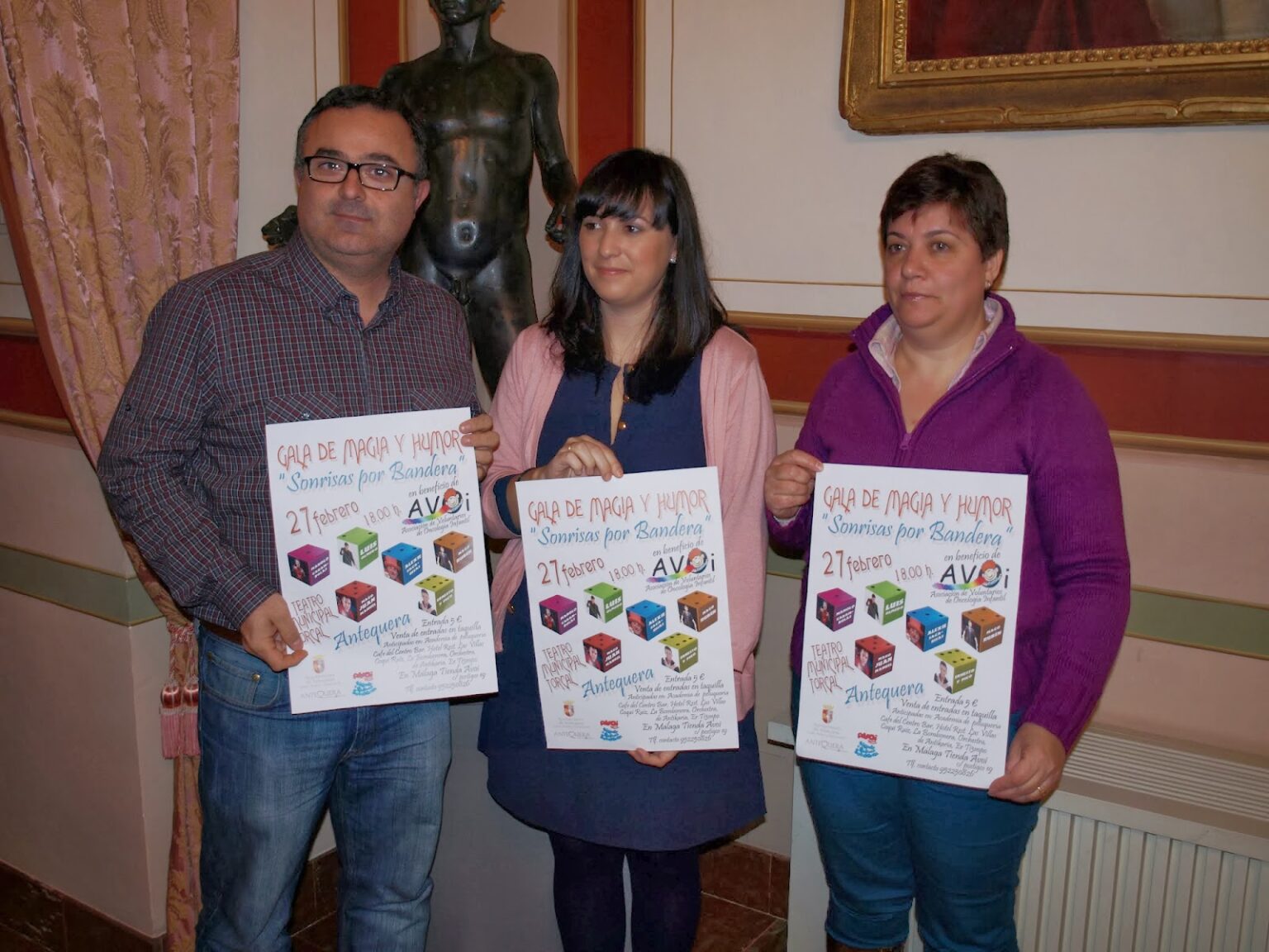 La teniente de alcalde responsable del área de Cultura del Ayuntamiento de Antequera, Ana Cebrián, acompañada por Juan Carmona, presidente de la Asociación de Voluntarios para la Oncología Infantil (AVOI) en Málaga y la responsable en Antequera de la tienda de esta asociación, Carmen Molina, han presentado en la mañana de hoy el espectáculo benéfico que tendrá lugar el próximo 27 de febrero a las 6 de la tarde en el Teatro Torcal, titulado ‘Gala de Magia y Humor’.