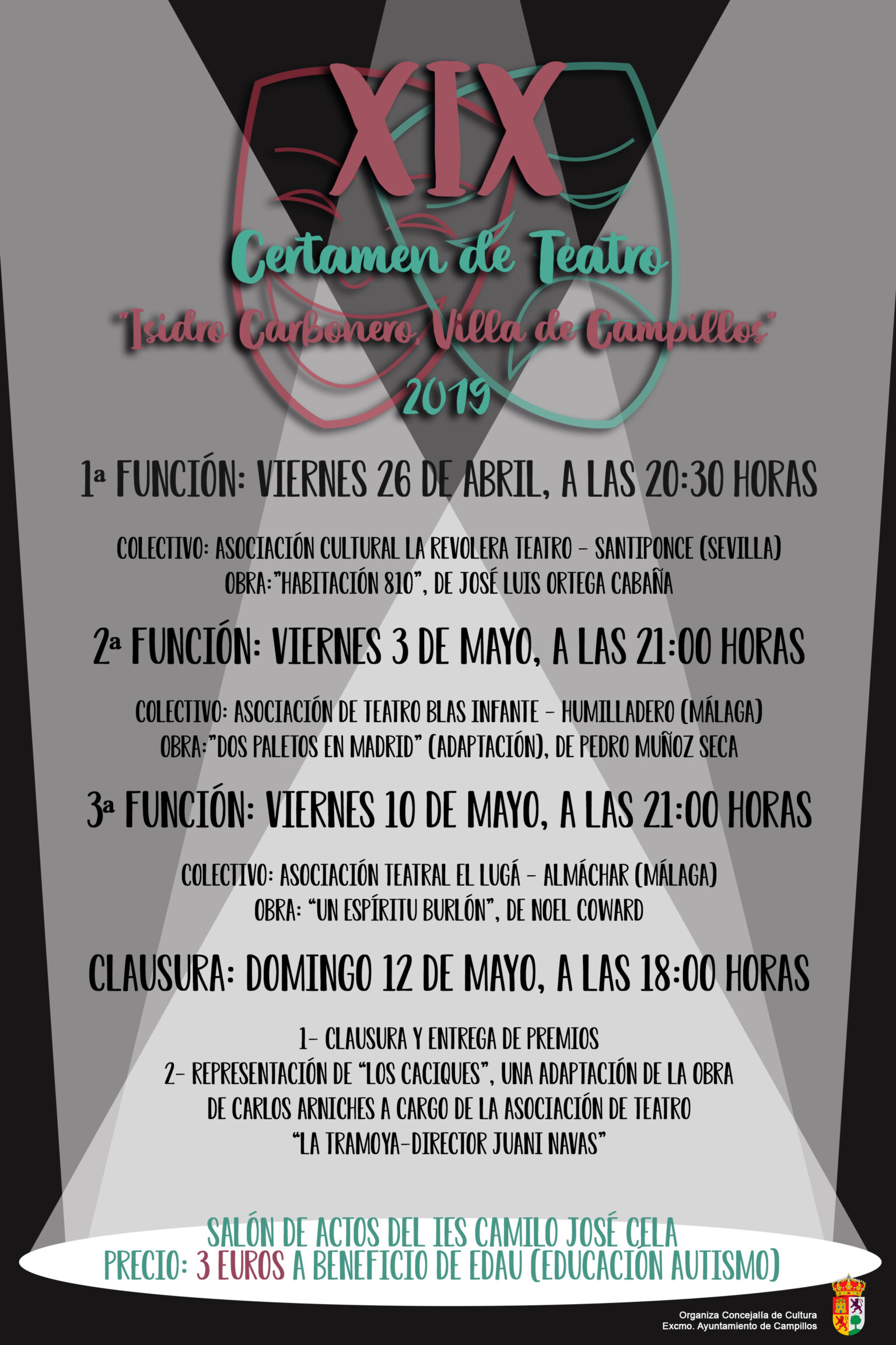 El XIX Certamen de Teatro “Isidro Carbonero Villa de Campillos” sube el telón este viernes 26 de abril con la interpretación de la obra Habitación 810. Los viernes 26 de Abril, 3 y 10 de Mayo y el domingo 12 de mayo, Campillos podrán disfrutar de representaciones teatrales.