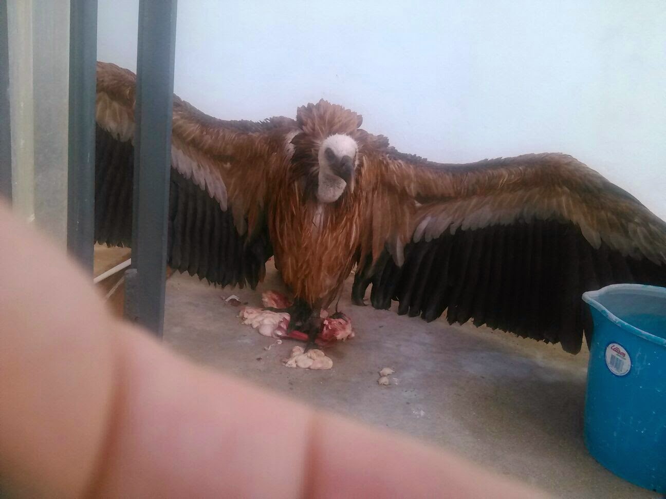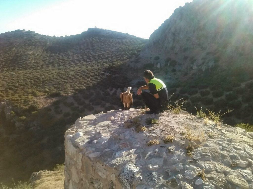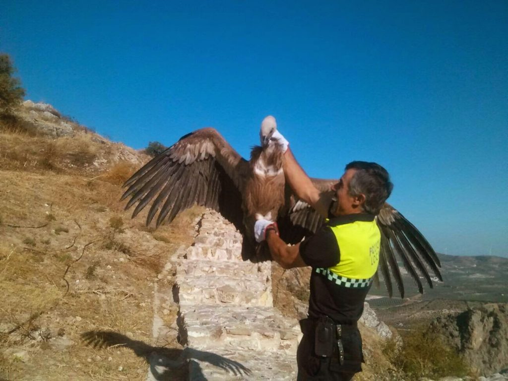 Durante las horas que ha permanecido este buitre en Archidona los agentes le han dado de comer y lo han refrescado. La Policía Local de Archidona ha rescatado distintos animales el último hasta ahora había sido el de una cría de búho real.