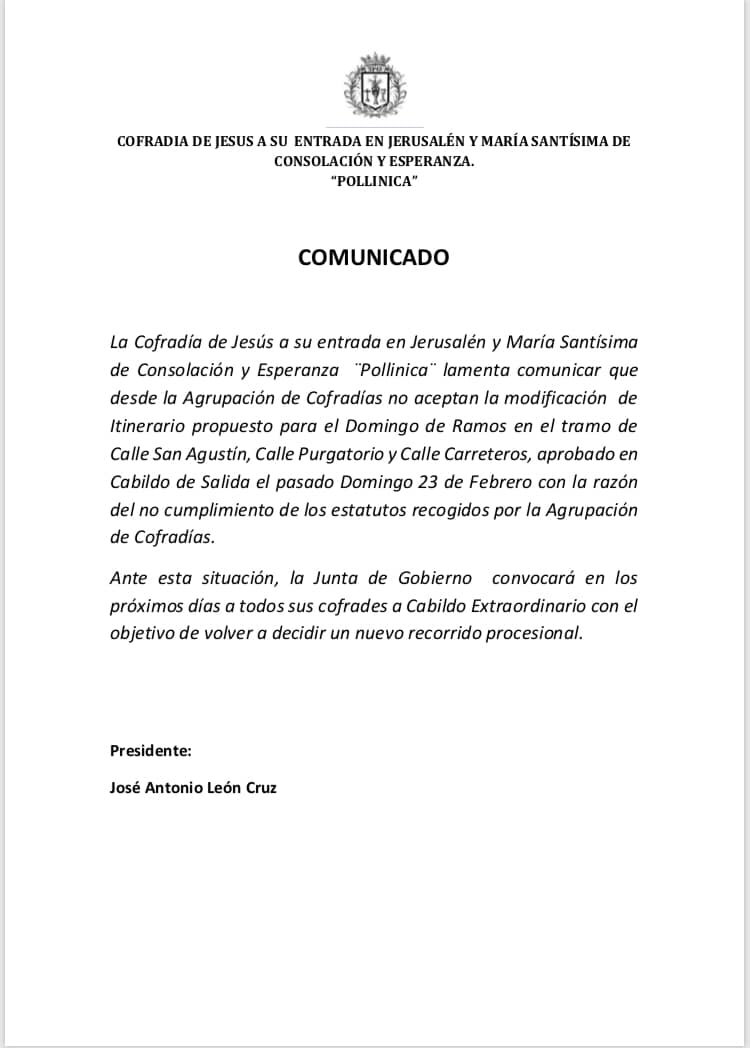 Según comunicado enviado por la Hermandad y firmado por su Hermano Mayor Jose Antonio León a nuestra redacción y publicado en sus redes sociales oficiales, su nuevo recorrido aprobado en Cabildo de Salida el 23 de febrero y del que dimos información hace algunos días que incluia el paso por las calles San Agustín, Purgatorio y Carreteros no fue aceptado en la anterior reunión de la Agrupación de Cofradías.