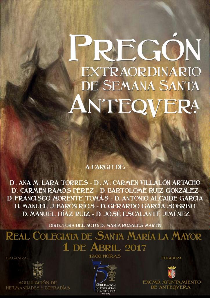 La Agrupación de Cofradías de Semana Santa de Antequera, ha estipulado que para el Pregón de la Semana Santa de este año 2017, este tenga un carácter magno, con motivo del 75 Aniversario de la Fundación de la Entidad Cofrade.