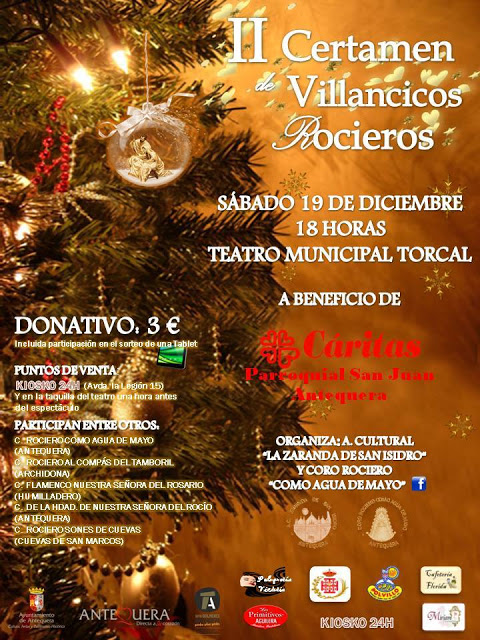 La Asociación Cultural La Zaranda de San Isidro y el Coro Rociero “Como agua de Mayo” organizan el segundo certamen de Villancicos Rocieros que tendrá lugar el sábado 19 de Diciembre a las 18.00 horas en el Teatro Municipal Torcal.