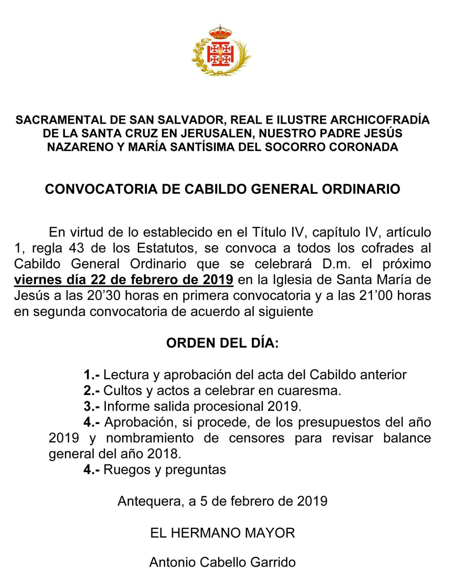 La Sacramental de San Salvador y Archicofradía de la Santa Cruz en Jerusalen, Nuestro Padre Jesús Nazareno y María Santísima del Socorro Coronada convoca a sus cofrades a Cabildo General Ordinario según marcan sus Estatutos el próximo viernes 22 de febrero en la iglesia de Santa María de Jesús a las 20.30 horas en primera convocatoria y a las 21.00 horas en segunda.