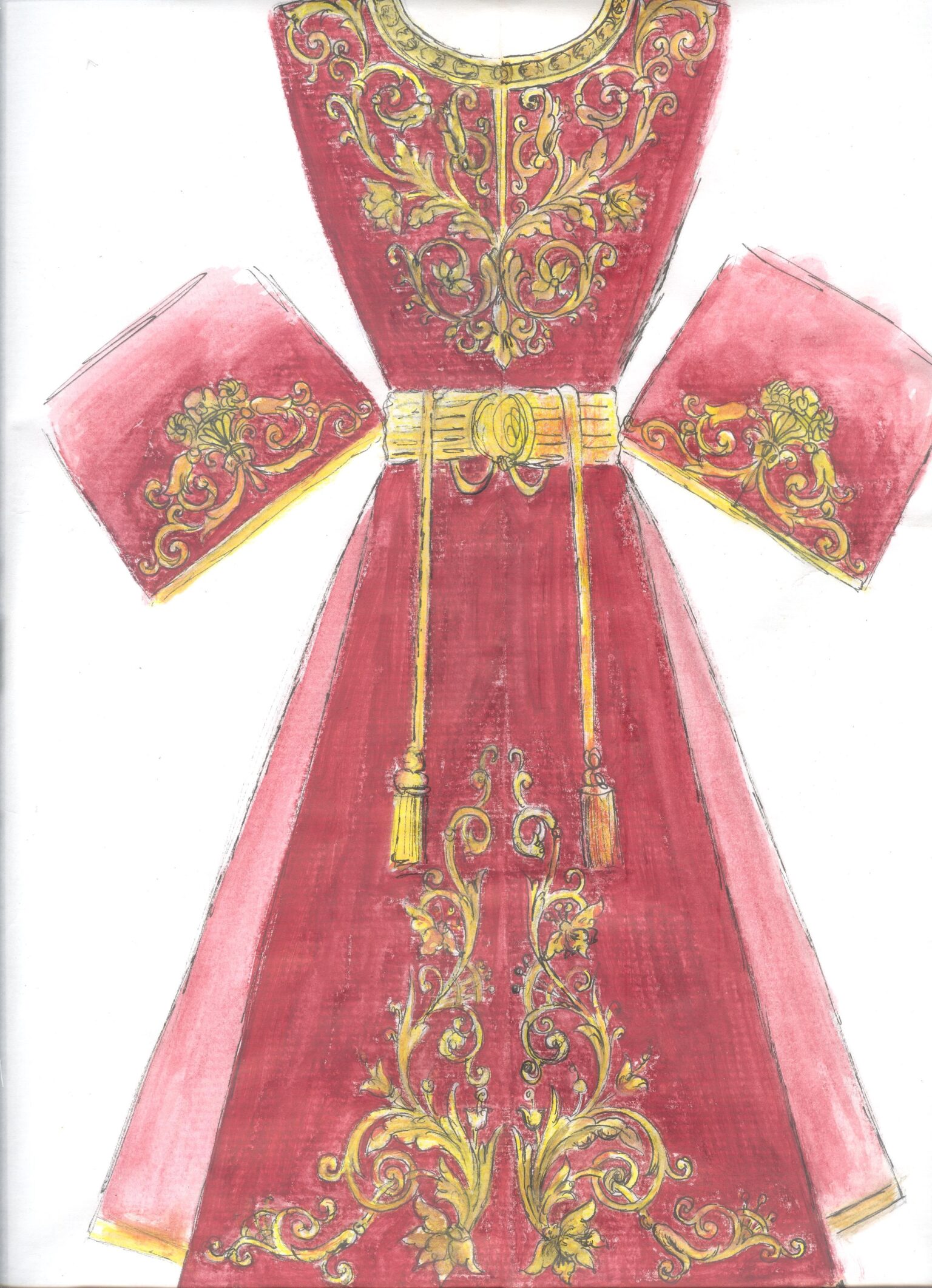 El diseño es de estilo clásico neobarroco y consta de bordados en pecho, mangas y parte inferior delantera de la túnica.