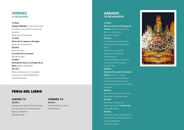 Tras celebración de Novena, los vecinos de Mollina se preparan para la procesión de su Patrona, la Virgen de la Oliva. Previamente el Viernes 14, a las nueve de la noche, será la Ofrenda de Flores a la Virgen de la Oliva en la Iglesia Parroquial.