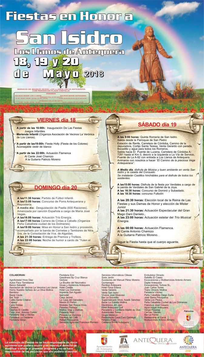 El sábado, 19 de mayo. A las 9.00 horas saldrá la quinta romería de San Isidro desde la Iglesia Parroquial de San Pedro de Antequera. El recorrido será Calle San Pedro, Cruz Blanca, Avenida de la Estación, Estación de Renfe, Carretera de Córdoba, Camino de la Depuradora, Cortijo Santa Teresa, Venta Gerardo (con parada y entrega de bocadillo y agua para todos los romeros), continuará la peregrinación con salida hacia el puente de Lucena, Carretera de Córdoba A-7281 hasta el kilómetro 0 y desvio a la izquierda a la Vía de Servicio para entrar por el puente de la A92 a los Llanos de Antequera. Camino por la preciosa vega de Antequera.