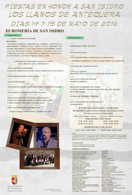 Los Llanos de Antequera viven este fin de semana las fiestas en honor de San Isidro Labrador. El sábado a las nueve de la mañana dará comienzo la tercera Romería que partirá desde la Iglesia Parroquial de San Pedro y transcurrirá por calle San Pedro, Cruz Blanca, Avenida de la Estación, Estación de Renfe, Carretera de Córdoba, Camino de la Depuradora, Cortijo Santa Teresa, Venta Gerardo donde se desarrollará primera parada, continuará por el Puente de Lucena, Valencia y Mayorga, hacia la carretera de Málaga a 2 kilómetros del desvío a la derecha camino hacia el puente de la A-92 con entrada a Los Llanos.