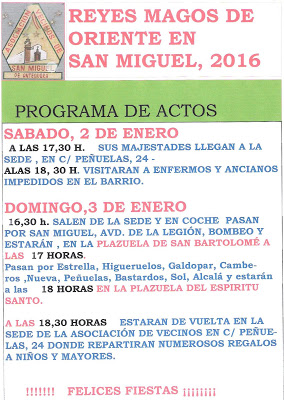 Los Reyes Magos visitarán los próximos días 2 y 3 de enero la sede social de la asociación de vecinos del barrio de San Miguel (Antequera). Durante estos dos días sus majestades verán a enfermos y ancianos del barrio, pasearán por la plazuela de San Bartolomé y los alrededores, y repartirán juguetes a los más pequeños, pero también a los mayores.