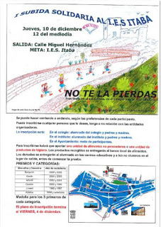 Mañana, 10 de Diciembre, a las doce del mediodía tendrá lugar la ‘I Subida Solidaria al I.E.S Itaba‘. El punto de salida será en la calle Miguel Hernández y la meta en el I.E.S Itaba.