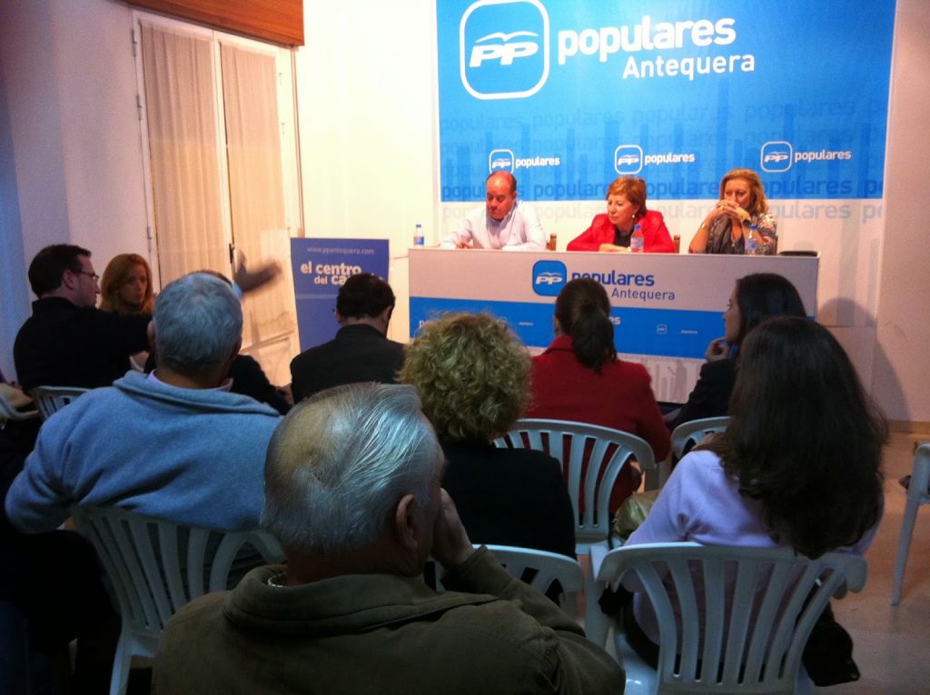El alcalde de Antequera y presidente del Partido Popular en el municipio, Manolo Barón, y las diputadas nacionales, Celia Villalobos y Carolina España, mantuvieron ayer por la tarde un encuentro con afiliados y simpatizantes del Partido Popular en la sede del PP de Antequera, al que también han acudido alcaldes y miembros del Partido Popular de otros municipios de la Comarca.