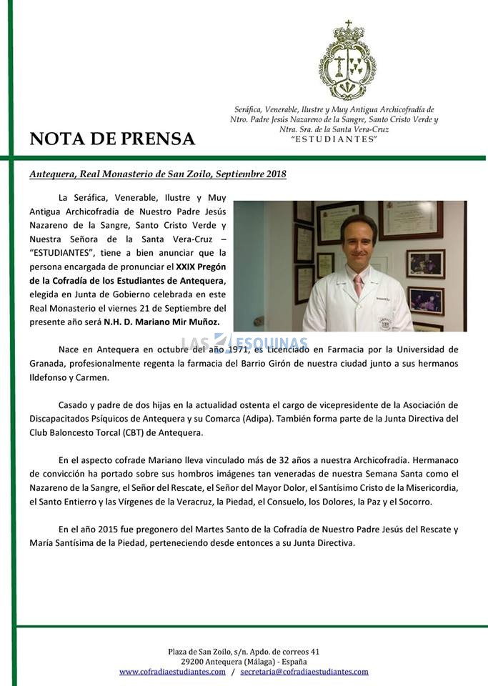 La Archicofradía de los Estudiantes de Antequera anuncia que Mariano Mir Muñoz será la persona encargada de pronunciar el 29ª Pregón de la Archicofradía. Tras reunión de su Junta de Gobierno el pasado 21 de septiembre.