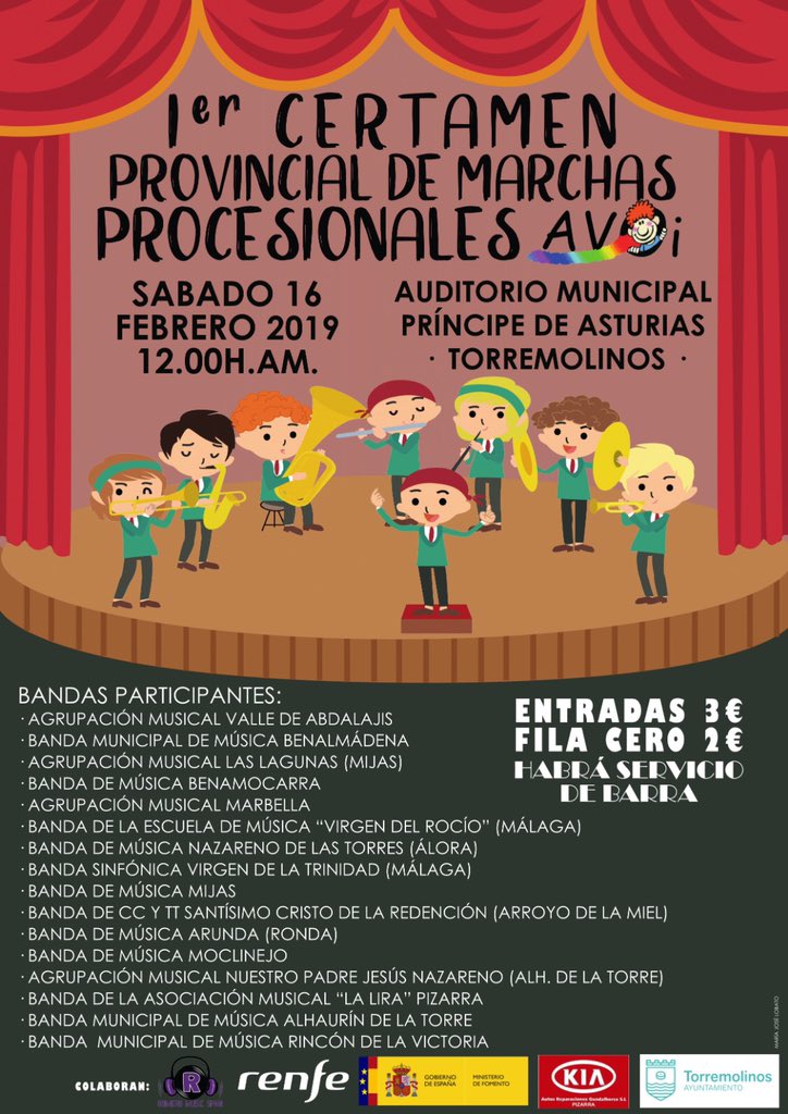 El colectivo AVOI celebra este próximo sábado 16 de febrero el primer certamen provincial de marchas procesionales. Será a partir de las 12.00 horas en el Auditorio Municipal Principe de Asturias de Torremolinos.