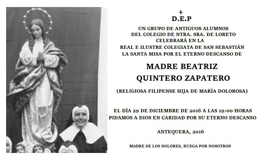 Un grupo de antiguos alumnos y alumnas del Colegio Nuestra Señora de Loreto de Antequera celebrarán en la Iglesia de San Sebastián una Santa Misa por el eterno descanso de Madre Beatriz Quintero Zapatero.