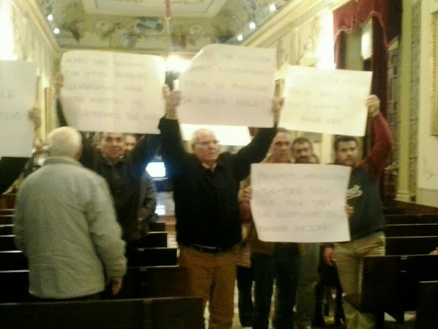 Nuevos carteles de protesta en el pleno ordinario en el Ayuntamiento de Antequera. En esta ocasión, una quincena de vecinos de la zona del cerro de San Cristóbal han sacado una serie de pancartas en las que protestan por la situación de acondicionamiento que sufre este espacio de la ciudad que sigue pendiente del plan especial de mejora del medio urbano. Esta falta de reconocimiento urbanístico hace que las casas de esta zona no tengan agua ni otro tipo de servicios.