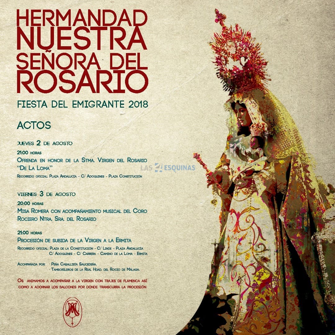 La Hermandad de Nuestra Señora del Rosario, Patrona de Villanueva del Rosario, organiza diferentes cultos a la Patrona con motivo de la Fiesta del Emigrante 2018.