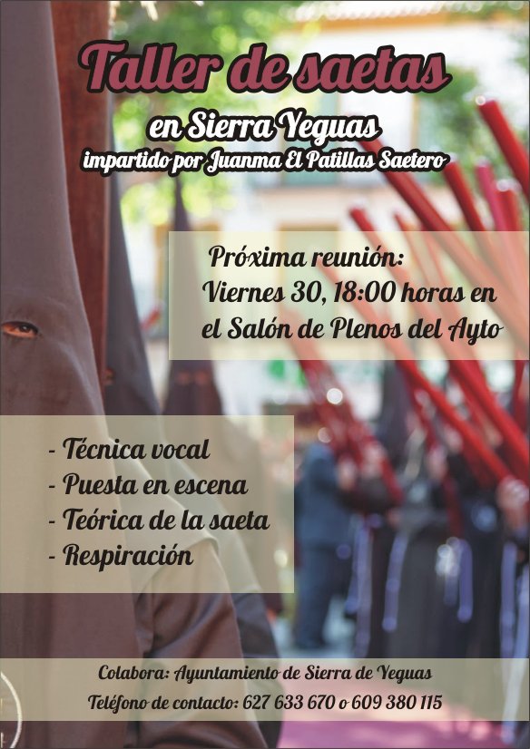 El saetero Juanma El Patillas impartirá un taller de saetas en Sierra de Yeguas, siendo la primera reunión el próximo viernes 30 de Noviembre.