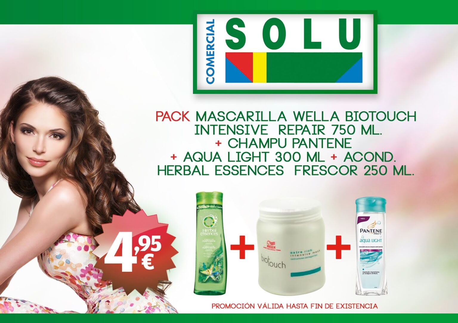 Pack de mascarilla Wella Biotouch Intensive Repair 750 ml + champú Pantene Aqua Light 300 ml + acondicionador Herbal Essences Frescos 250ml por 4,95€. Válido hasta fin de existencias.