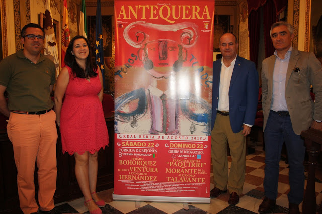 El alcalde de Antequera, Manuel Barón, la teniente de alcalde de Cultura, Ferias y Patrimonio Histórico, Ana Cebrián, y el empresario taurino José Cutiño han presentado en la mañana de hoy los carteles taurinos de la Real Feria de Agosto de Antequera 2015. Una corrida de rejones y una corrida de toros conforman un programa taurino que se desarrollará del sábado 22 al domingo 23 de agosto en la centenaria Plaza de Toros de Antequera y en la que se reunirán grandes figuras del toreo como Morante de la Puebla, Paquirri o Talavante.