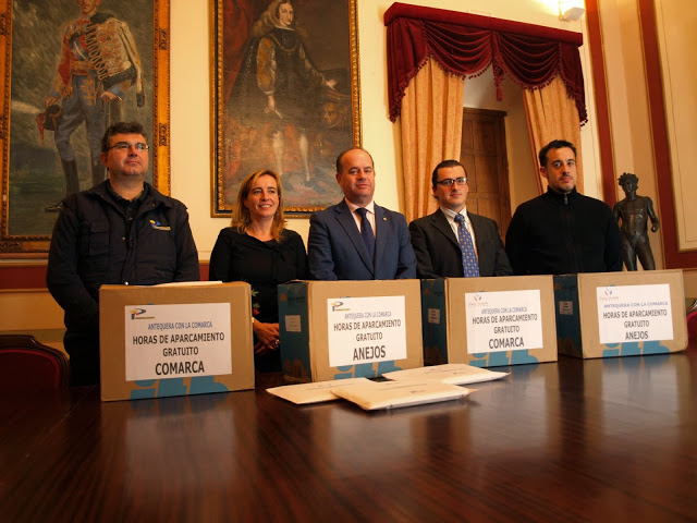 El alcalde de Antequera, Manolo Barón, además de la teniente de alcalde de Comercio y Turismo, Belén Jiménez, y el responsable de Parking Centro y Parking Plaza de Castilla, Manuel Carmona, representando al empresario Antonio Carmona, presentaron a los medios de comunicación la campaña comercial que esta Navidad repartirá 12.000 vales de parking gratuito por una hora de duración cada uno, que se repartirán a partirde hoy y hasta el próximo día 20 en los ayuntamientos y edificios de usos múltiples de los pueblos de la comarca y las pedanías de Antequera.