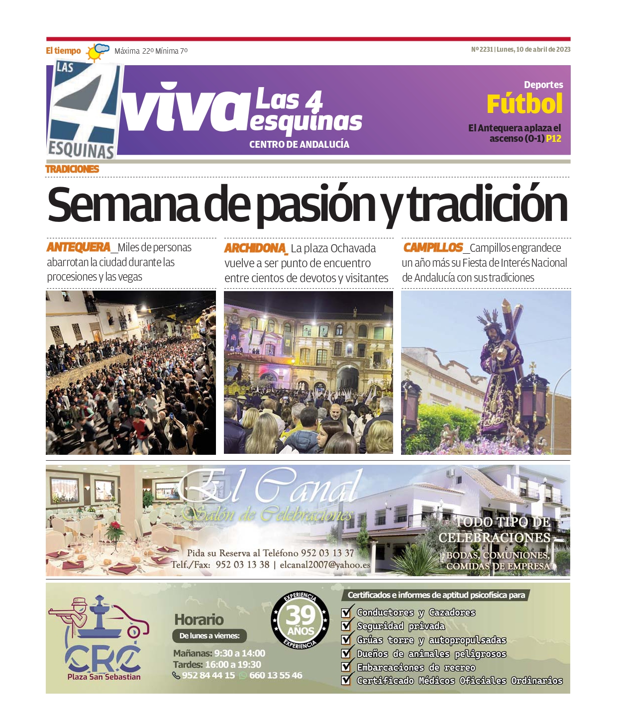 Actualidad|PublicacionesPeriódicos Periódico | VIVA Las 4 Esquinas 10 abril – Semana de pasión y tradición Última actualización 14 de marzo de 2025 16:11 admin Compartir Compartir Pincha aquí para leer gratis nuestro periódico Comparte este artículo Facebook Copiar link Imprimir No hay comentarios Deja una respuesta Cancelar la respuestaTu dirección de correo electrónico no será publicada. Los campos obligatorios están marcados con *Comentario * Nombre * Correo electrónico * Web Guarda mi nombre, correo electrónico y web en este navegador para la próxima vez que comente. Últimas noticias Farmacias de Guardia en Antequera – Abril 2025 14 de marzo de 2025 Ese nadie 14 de marzo de 2025 Concluye la adecuación del camino de arroyo Cerezo en Villanueva del Rosario tras una inversión de 253.000 euros 14 de marzo de 2025 PSOE e IU solicitan al PP la adhesión de Archidona a la futura Mancomunidad de Municipios 14 de marzo de 2025 Las lluvias de marzo dejan 230 litros en Antequera y un consumo mínimo garantizado para 3 años 14 de marzo de 2025 Lo más leido Farmacias de Guardia en Antequera – Abril 2025 14 de marzo de 2025 Ese nadie 14 de marzo de 2025 Concluye la adecuación del camino de arroyo Cerezo en Villanueva del Rosario tras una inversión de 253.000 euros 14 de marzo de 2025 PSOE e IU solicitan al PP la adhesión de Archidona a la futura Mancomunidad de Municipios 14 de marzo de 2025 Las lluvias de marzo dejan 230 litros en Antequera y un consumo mínimo garantizado para 3 años 14 de marzo de 2025 Síguenos 304.9kMe gusta3.04MSeguir304.9kPin844.87MSeguir40.49MSuscribirse39.5kSeguir