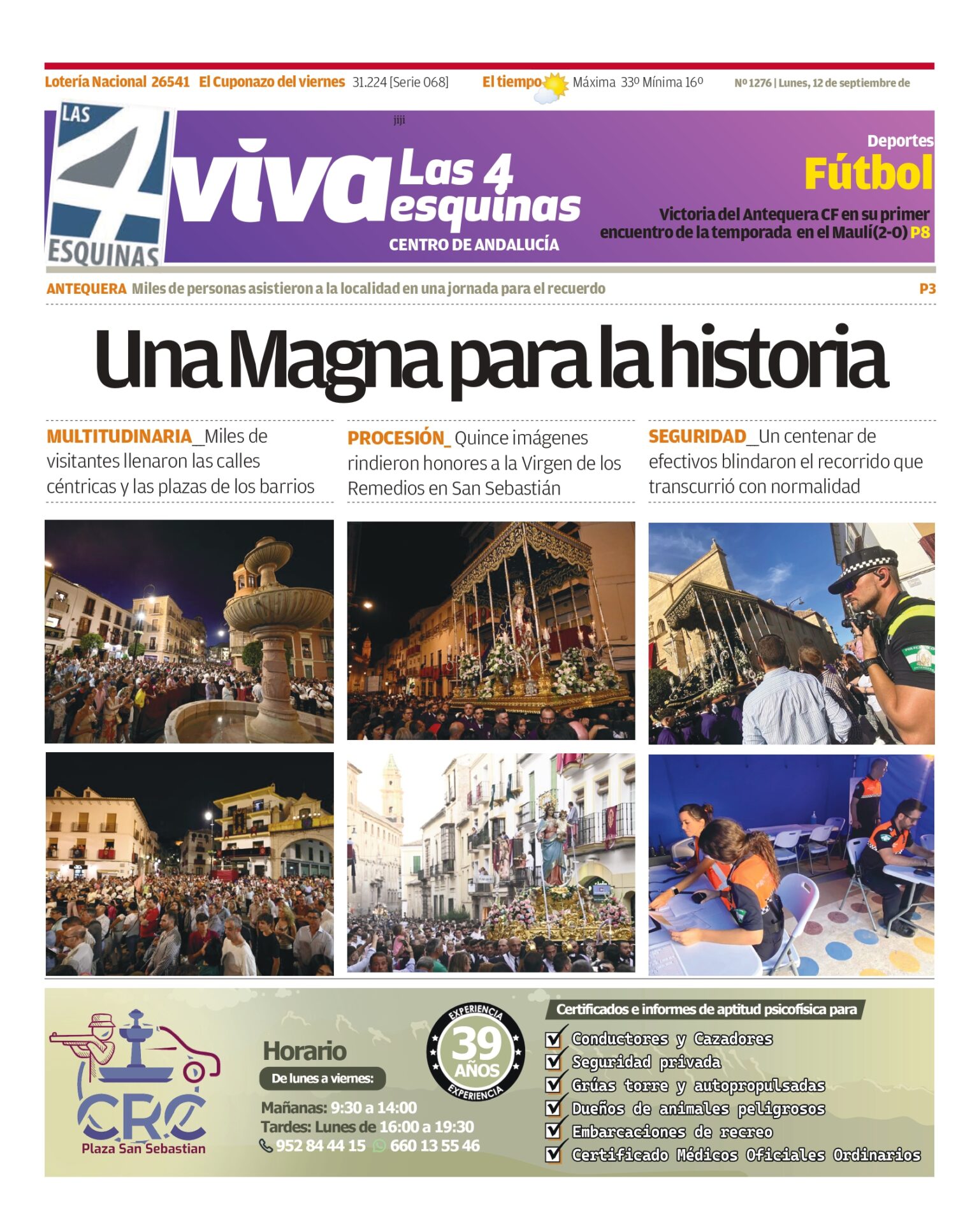 Actualidad|PublicacionesPeriódicos Periódico | VIVA Las 4 Esquinas 12 septiembre – Una Magna para la historia Última actualización 14 de marzo de 2025 16:02 admin Compartir Compartir Pincha aquí para leer gratis nuestro periódico Comparte este artículo Facebook Copiar link Imprimir No hay comentarios Deja una respuesta Cancelar la respuestaTu dirección de correo electrónico no será publicada. Los campos obligatorios están marcados con *Comentario * Nombre * Correo electrónico * Web Guarda mi nombre, correo electrónico y web en este navegador para la próxima vez que comente. Últimas noticias Farmacias de Guardia en Antequera – Abril 2025 14 de marzo de 2025 Ese nadie 14 de marzo de 2025 Concluye la adecuación del camino de arroyo Cerezo en Villanueva del Rosario tras una inversión de 253.000 euros 14 de marzo de 2025 PSOE e IU solicitan al PP la adhesión de Archidona a la futura Mancomunidad de Municipios 14 de marzo de 2025 Las lluvias de marzo dejan 230 litros en Antequera y un consumo mínimo garantizado para 3 años 14 de marzo de 2025 Lo más leido Farmacias de Guardia en Antequera – Abril 2025 14 de marzo de 2025 Ese nadie 14 de marzo de 2025 Concluye la adecuación del camino de arroyo Cerezo en Villanueva del Rosario tras una inversión de 253.000 euros 14 de marzo de 2025 PSOE e IU solicitan al PP la adhesión de Archidona a la futura Mancomunidad de Municipios 14 de marzo de 2025 Las lluvias de marzo dejan 230 litros en Antequera y un consumo mínimo garantizado para 3 años 14 de marzo de 2025 Síguenos 304.9kMe gusta3.04MSeguir304.9kPin844.87MSeguir40.49MSuscribirse39.5kSeguir