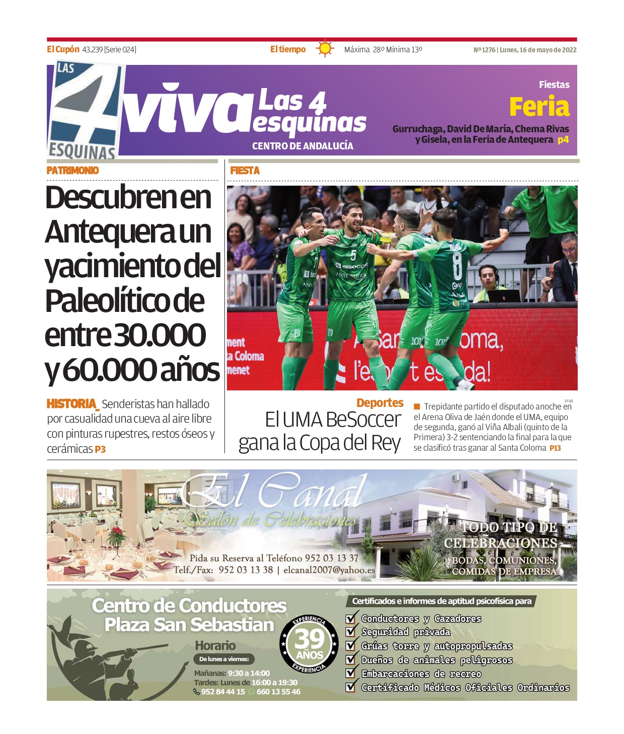 Periódico | VIVA Las 4 Esquinas 16 mayo – Descubren en Antequera un yacimiento del Paleolítico de entre 30.000 y 60.000 años