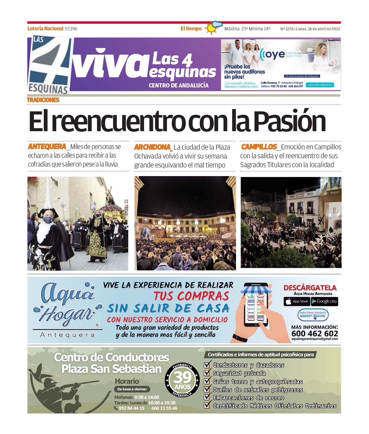 Actualidad|PublicacionesPeriódicos Periódico | VIVA Las 4 Esquinas 18 abril – El reencuentro con la Pasión Última actualización 14 de marzo de 2025 15:56 admin Compartir Compartir Pincha aquí para leer gratis nuestro periódico Comparte este artículo Facebook Copiar link Imprimir No hay comentarios Deja una respuesta Cancelar la respuestaTu dirección de correo electrónico no será publicada. Los campos obligatorios están marcados con *Comentario * Nombre * Correo electrónico * Web Guarda mi nombre, correo electrónico y web en este navegador para la próxima vez que comente. Últimas noticias Farmacias de Guardia en Antequera – Abril 2025 14 de marzo de 2025 Ese nadie 14 de marzo de 2025 Concluye la adecuación del camino de arroyo Cerezo en Villanueva del Rosario tras una inversión de 253.000 euros 14 de marzo de 2025 PSOE e IU solicitan al PP la adhesión de Archidona a la futura Mancomunidad de Municipios 14 de marzo de 2025 Las lluvias de marzo dejan 230 litros en Antequera y un consumo mínimo garantizado para 3 años 14 de marzo de 2025 Lo más leido Farmacias de Guardia en Antequera – Abril 2025 14 de marzo de 2025 Ese nadie 14 de marzo de 2025 Concluye la adecuación del camino de arroyo Cerezo en Villanueva del Rosario tras una inversión de 253.000 euros 14 de marzo de 2025 PSOE e IU solicitan al PP la adhesión de Archidona a la futura Mancomunidad de Municipios 14 de marzo de 2025 Las lluvias de marzo dejan 230 litros en Antequera y un consumo mínimo garantizado para 3 años 14 de marzo de 2025 Síguenos 304.9kMe gusta3.04MSeguir304.9kPin844.87MSeguir40.49MSuscribirse39.5kSeguir