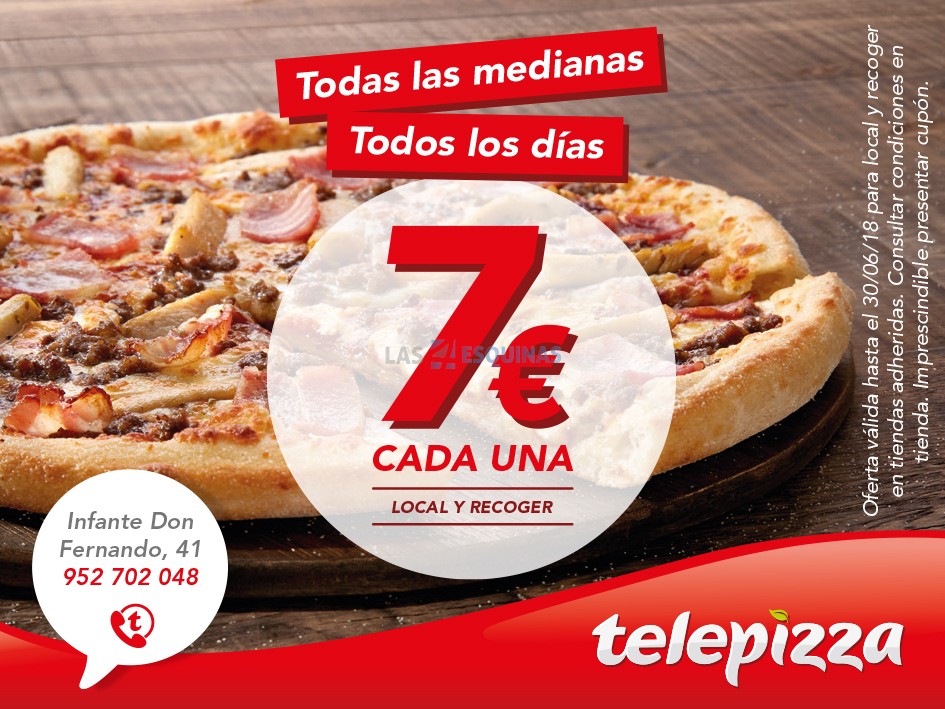 Todas las medianas todos los días a 7€ cada una, válida para local y recoger en tiendas Telepizza adheridas. Consultar condiciones en tienda. Imprescindible presentar cupón.