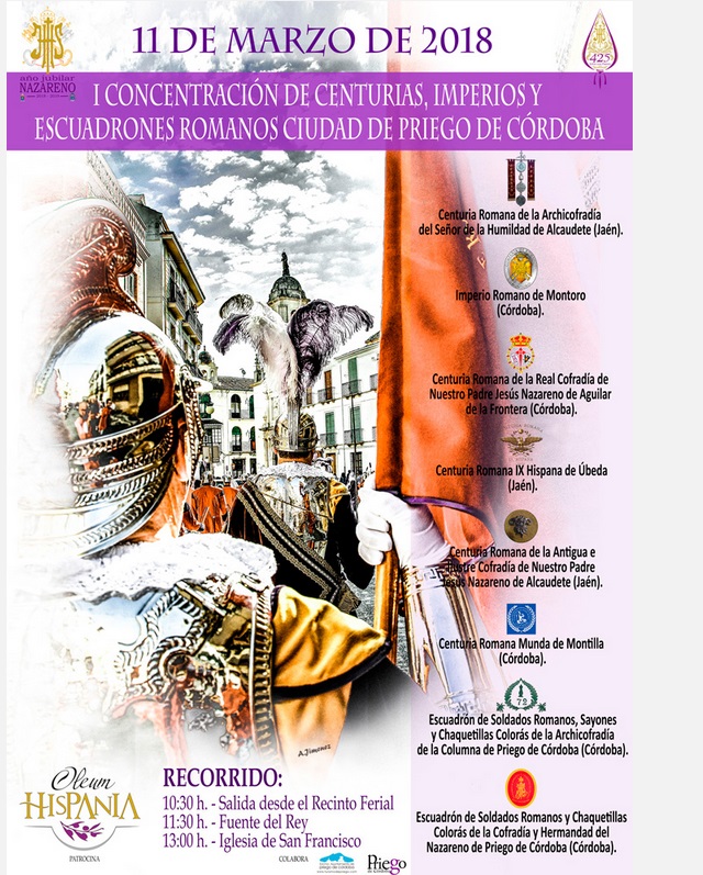 El próximo domingo 11 de marzo tiene lugar la primera concentración de Centurias, Imperios y Escuadrones Romanos “Ciudad de Priego” con motivo del 425 Aniversario Fundacional, la concesión del Año Jubilar así como la conmemoración del 300 Aniversario de la fundación del Escuadrón de Soldados Romanos y Chaquetillas Colorás, que tuvo su origen en la concordia firmada por las hermandades de la columna, Soledad y Nazareno en 1718.